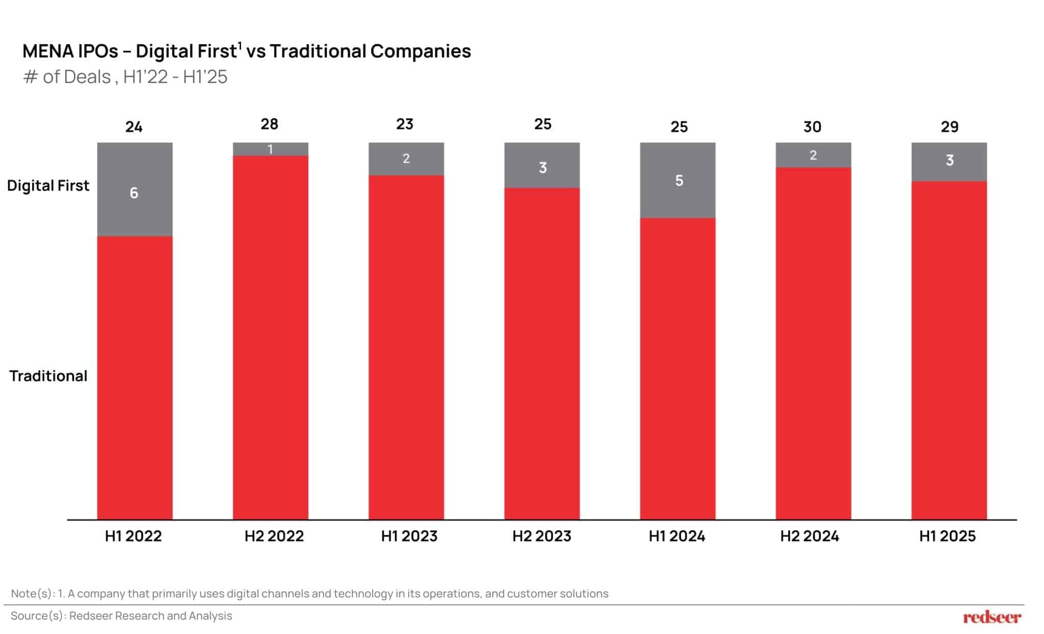 In our 5 Predictions for the MENA Digital Economy report last year, we expected 10 Tech IPOs in 2025. At mid-year, only three tech listings have materialized. While H2 typically carries heavier deal flow, a number of tech players are now likely to shift their listings into 2026 as they wait out geopolitical uncertainty.