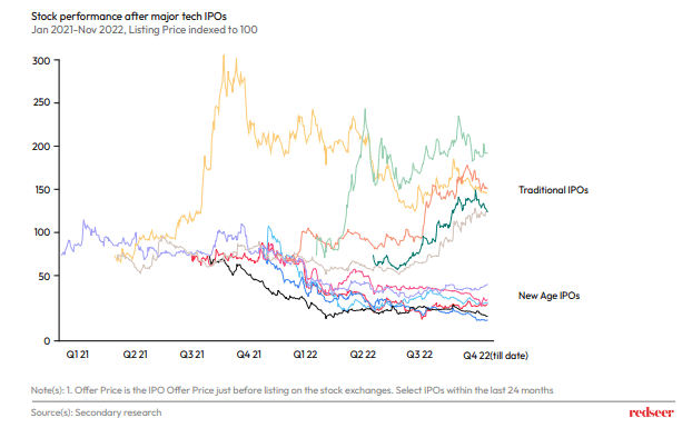 Due to the ongoing global macro situation, with rising interest rates, profits are much more valuable. A typical company that would be cash flow positive two years from now would see discounting of at least 20-30% of their valuations in a low-interest rate situation, which goes up significantly in a high-interest rate situation which we are seeing right now. And Tech/New-Age companies have prioritized growth at higher costs. Therefore, of the companies listed in the last couple of years, while traditional IPOs in India saw milder corrections in valuations, in comparison to that of Tech/New-Age listings.
