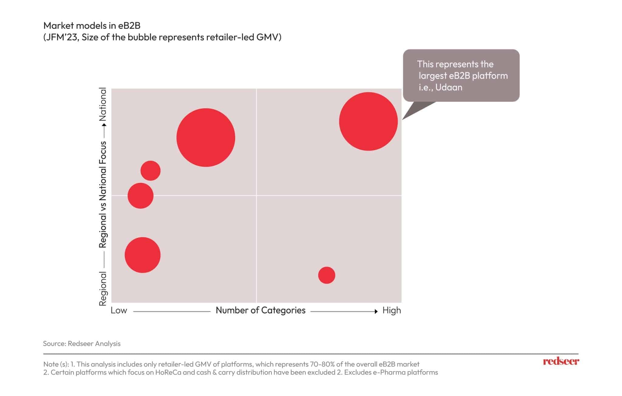 EB2B platforms can be broadly divided along the lines of geographical focus (regional vs national) and the number of categories they have a presence in. India currently has a few multicategory platforms with a national presence in segments like General Merchandise, Groceries (staples & FMCG), Accessories, and Electronics among others. The inventory model followed by these platforms effectively enables them to leverage staples to drive low-cost distribution penetration, increase the frequency of service in any location, and subsequently monetize the distribution chain through other non-staple categories. This invariably helps create the right gross margin to cost structure balance.