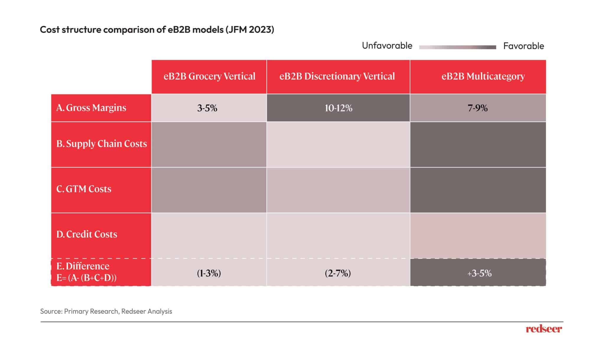 Supply chain costs in the eB2B space are seen to exceed 8-10% of Gross Merchandise Value (GMV) and in turn contribute significantly to operating expenses. The multicategory approach can imbue the value chain with higher demand predictability and better utilization of the delivery fleet among other aspects.�� This is particularly beneficial for the grocery segment wherein higher order frequencies, lower gross margins, and higher fleet utilization often lead to suboptimal profitability. Discretionary products including Footwear and General Merchandise see lower tonnage and fleet utilization hike up supply chain costs.