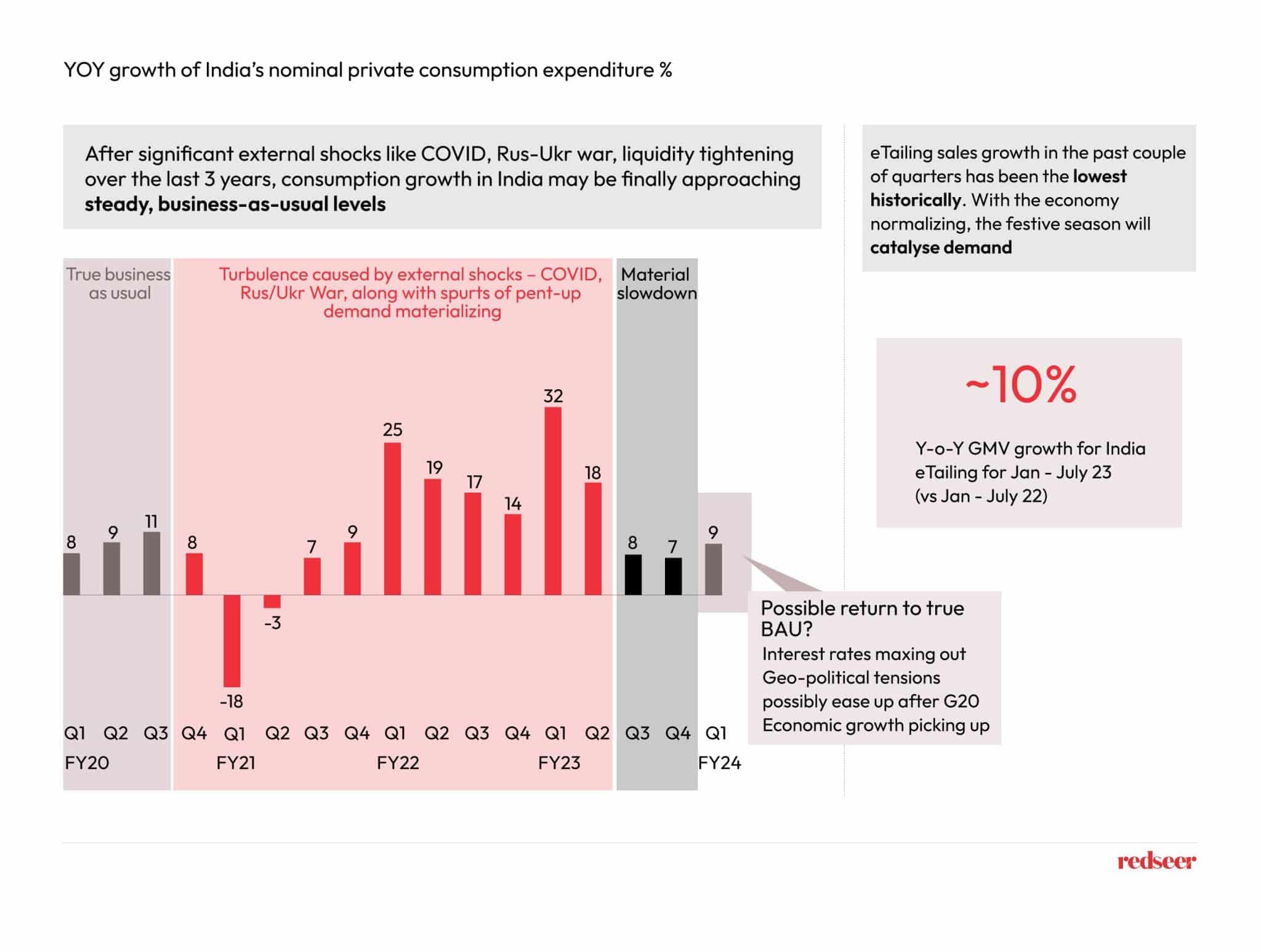With the festive season on the horizon, all eyes are on the sales figures that this major GMV player in the e-tailing industry is set to achieve. Throughout the month-long festive season in India, the entire ecosystem collaborates to captivate consumer interests. Join us as we delve into the resilience and recovery of India’s consumption landscape, providing insights into how the season is shaping up on Redseer’s barometer.