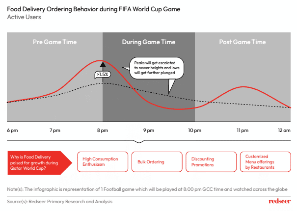 Change in consumer behaviour is driven by peak order timings, bulk ordering behaviour and increased preference towards world cup themed reward programs and customized menu offerings. This change is reflected in the peak ordering timings as consumer food ordering patterns fluctuate according to to match timings. During Pre-game times, Food delivery peaks escalate and the lows get further plunged during the game. Post-game time further sees an upward trend as consumers return to normal schedules.