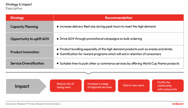 FoodTech players need to diligently plan their strategies to efficiently capitalize on the expected increased demands. Players should focus on capacity building to cater to the demand and uplifting AOV through rewards and discounts for bulk ordering. This is also an opportune time for players to strengthen their Q-commerce services demand by diligent product bundling of match day essentials.