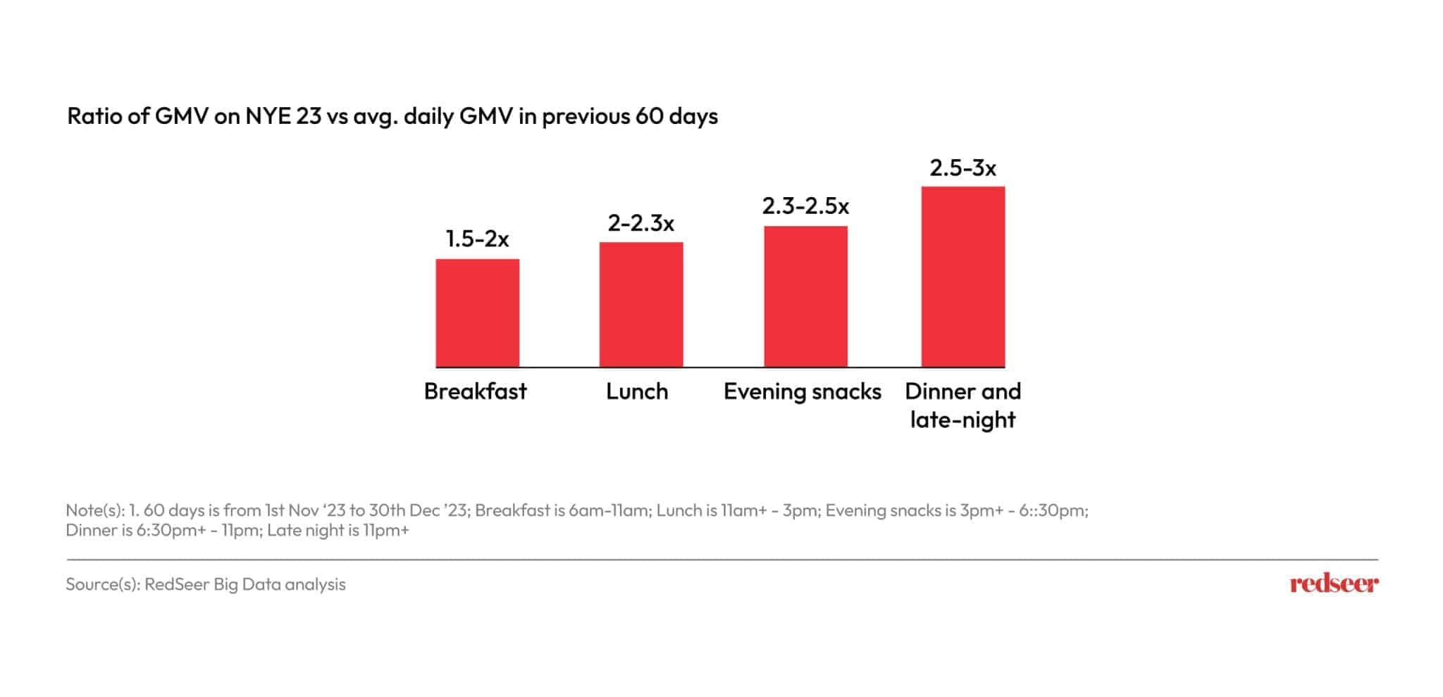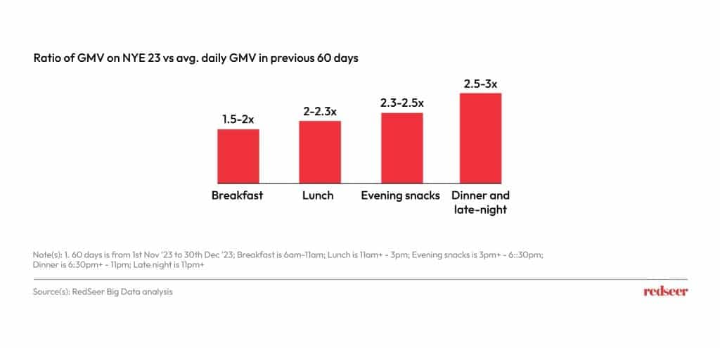 While the day started with GMV in breakfast being 1.5-2x of a normal day. GMV peaked in the dinner and late-night orders, being 2.5-3x of a normal day. The players also put their best foot forward as the day went on. For instance, Swiggy announced free deliveries all through the night of NYE23.