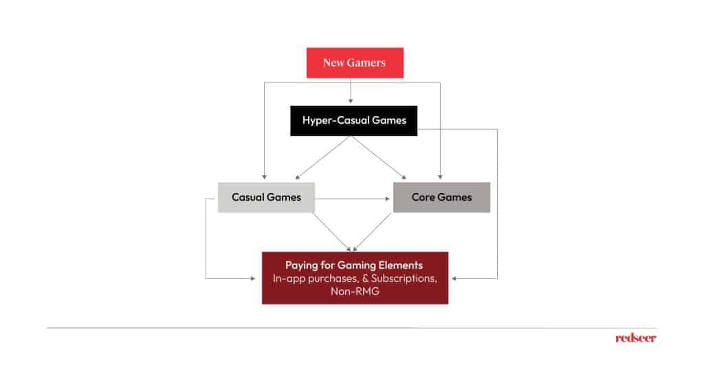 The conventional newcomer starts out with free hyper-casual gaming and progresses towards casual gaming. Some of them eventually mature into core gaming with in-gaming payments opening access to newer levels and elements, in addition to improving the overall experience. In the case of the adult and elder cohort, free alternatives to Real Money Gaming (RMG) serve as the first point of contact. India is currently looking at a 170-180 Mn strong community of core gamers in FY23 alone.