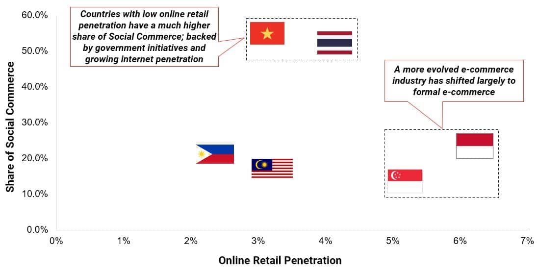 While social commerce share is relatively high across the ASEAN region, they exhibit varying trends based on 2 factors – a) income level of the country and b) maturity of online retail channel