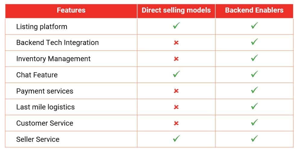 While direct selling models offer few features, they are the most popular method due to ease of use for both sellers and consumers. Backend enabler models are providing a wide array of features to help sellers and buyers, however they need to look at ways to monetize & increase operational efficiency.