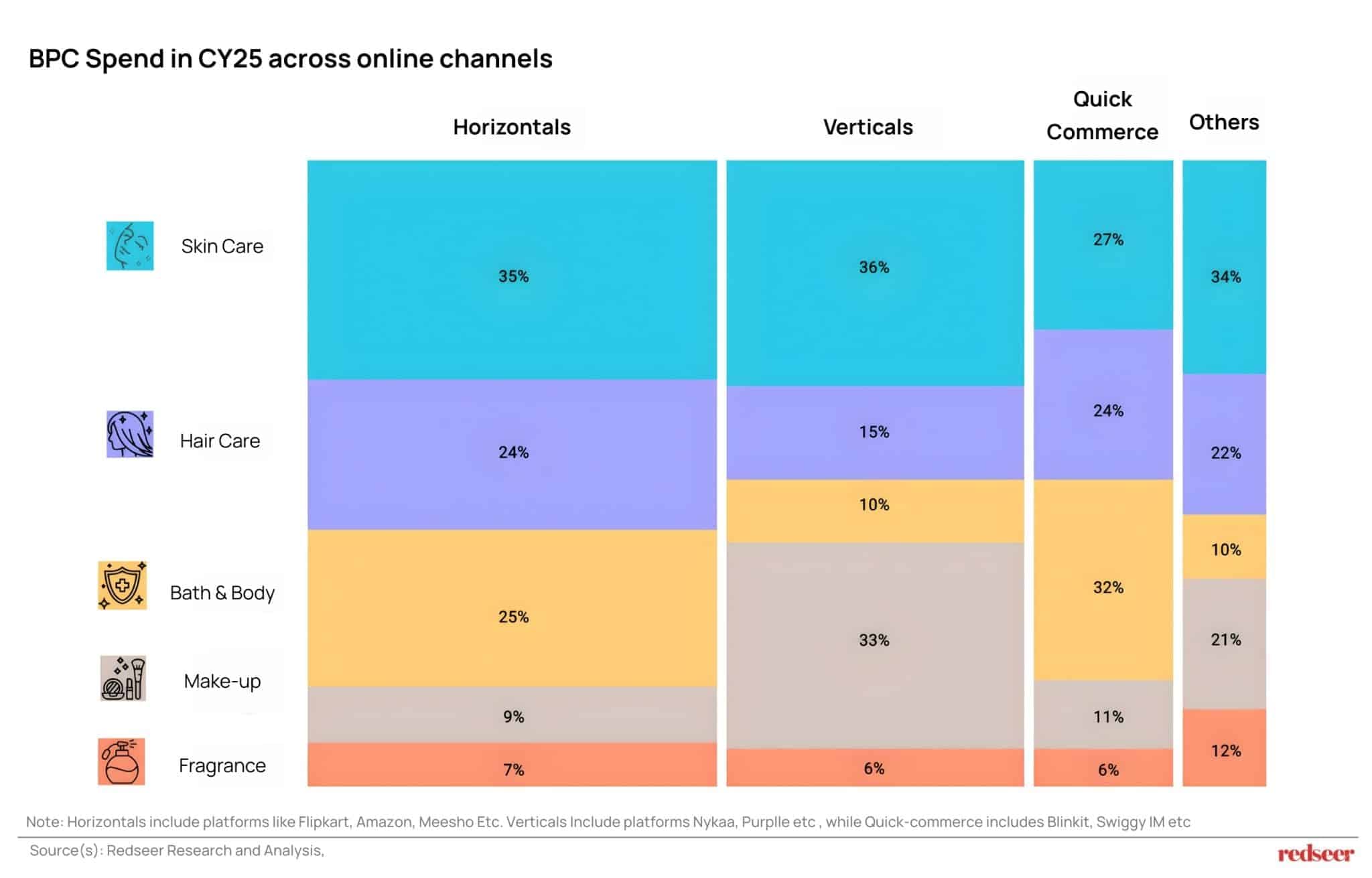 Importantly, quick commerce and horizontal platforms now show increasingly similar category compositions, particularly across replenishment-heavy segments such as skin care, hair care, and bath & body.