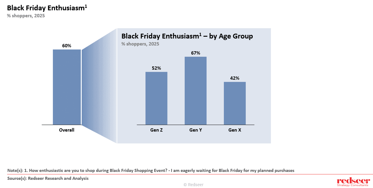 Shoppers in Saudi Arabia continue to show strong enthusiasm for Black Friday. This sustained momentum is largely driven by Gen Y consumers, who not only shop for themselves but also take on a larger share of household purchases. Their dual influence as personal and family shoppers makes them the backbone of this season’s retail energy. While other age groups are also participating, it is the spending readiness and decisive intent of Gen Y that sets the tone for the Saudi Black Friday market this year.
