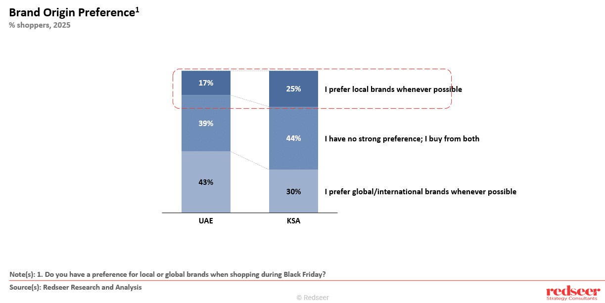 Saudi consumers show a clear inclination toward local brands, with their preference notably higher than in the UAE. This reflects KSA’s more locally rooted consumer base, unlike the UAE’s diverse expatriate mix that drives wider demand for international labels. Government efforts such as the “Made in Saudi” initiative have further strengthened trust and visibility for homegrown names.