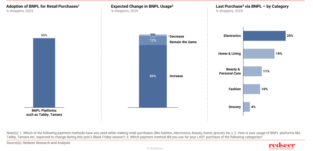More than 25% of consumers reported using BNPL for their last electronics purchase, and over 19% used it for home and living items, highlighting the traction in high-value categories. With these segments leading adoption, BNPL is set to become a critical enabler for larger purchases, allowing shoppers to access premium products while spreading payments over time.