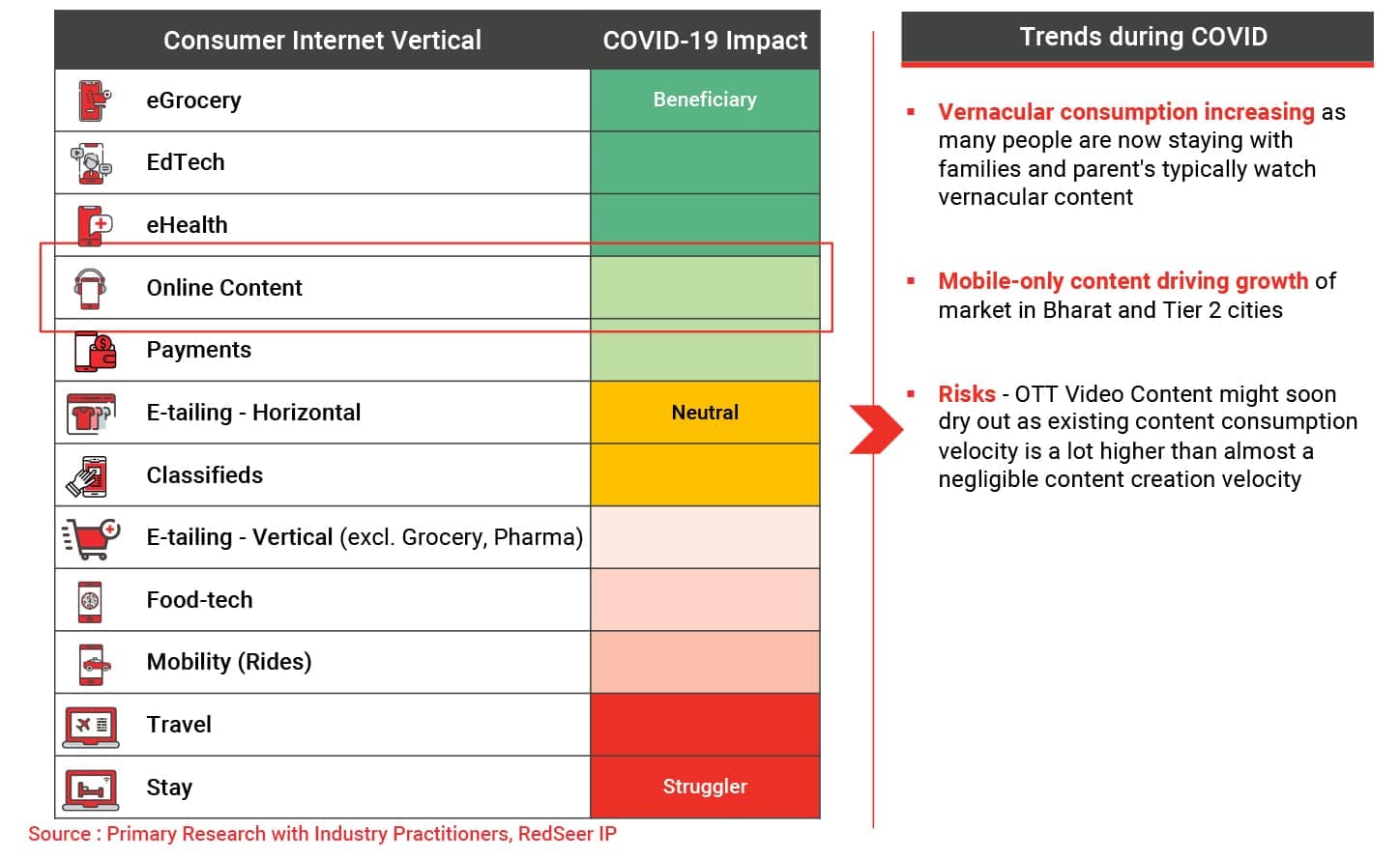 Online Content falls in the beneficiary segment with growth in OTT Video consumption and growth in traffic and engagement for shortform and news aggregator platforms.