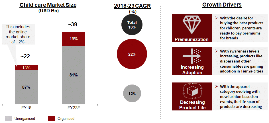 India’s child care products market in FY18 is pegged at USD~22 Billion and is expected to grow at a CAGR of ~13% for next 5 years