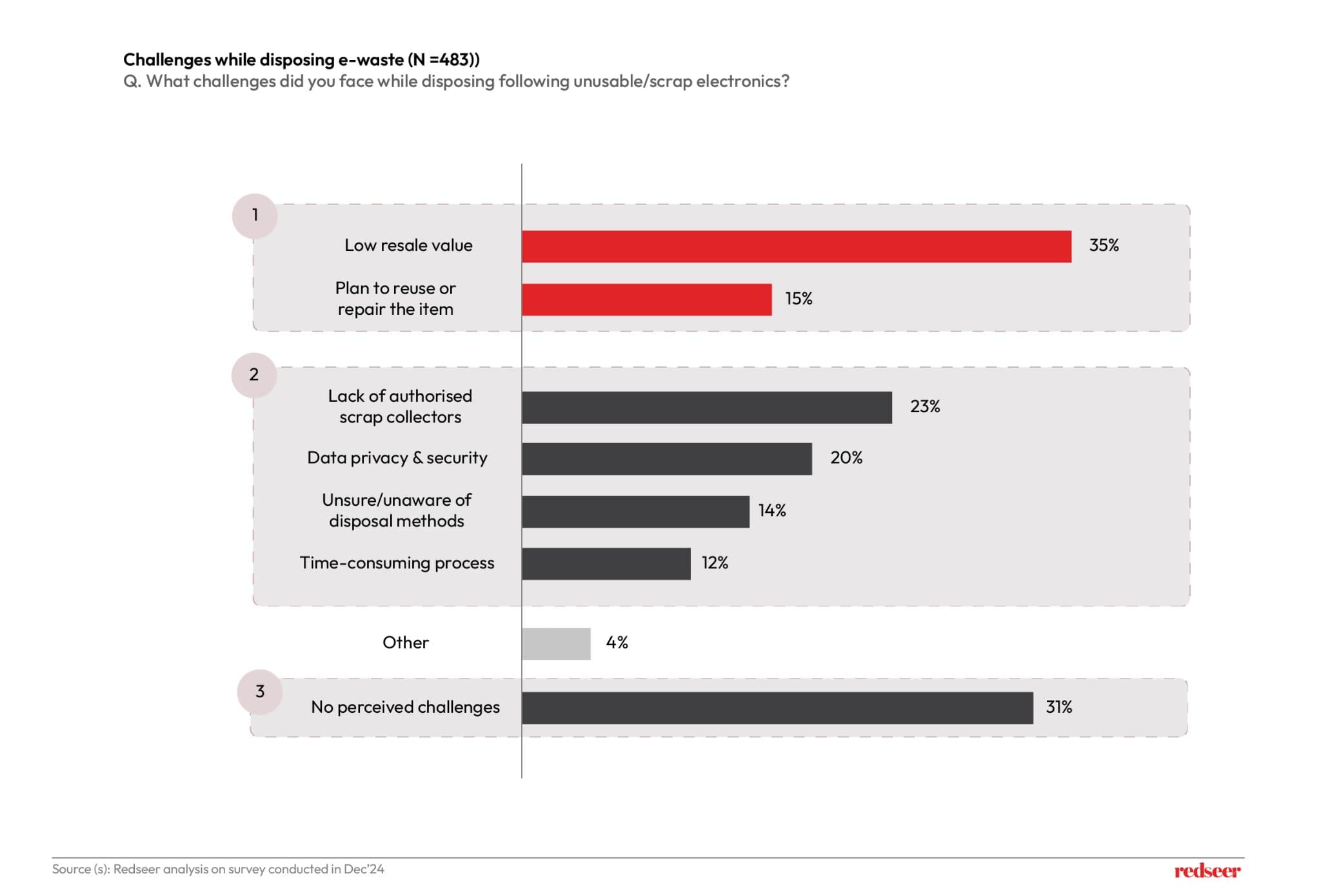3️. Lack of Knowledge on Disposal Methods: One-third of consumers report no challenges in e-waste disposal, not because the process is smooth and convenient, but because they are unaware of proper e-waste management practices and environmental impacts.