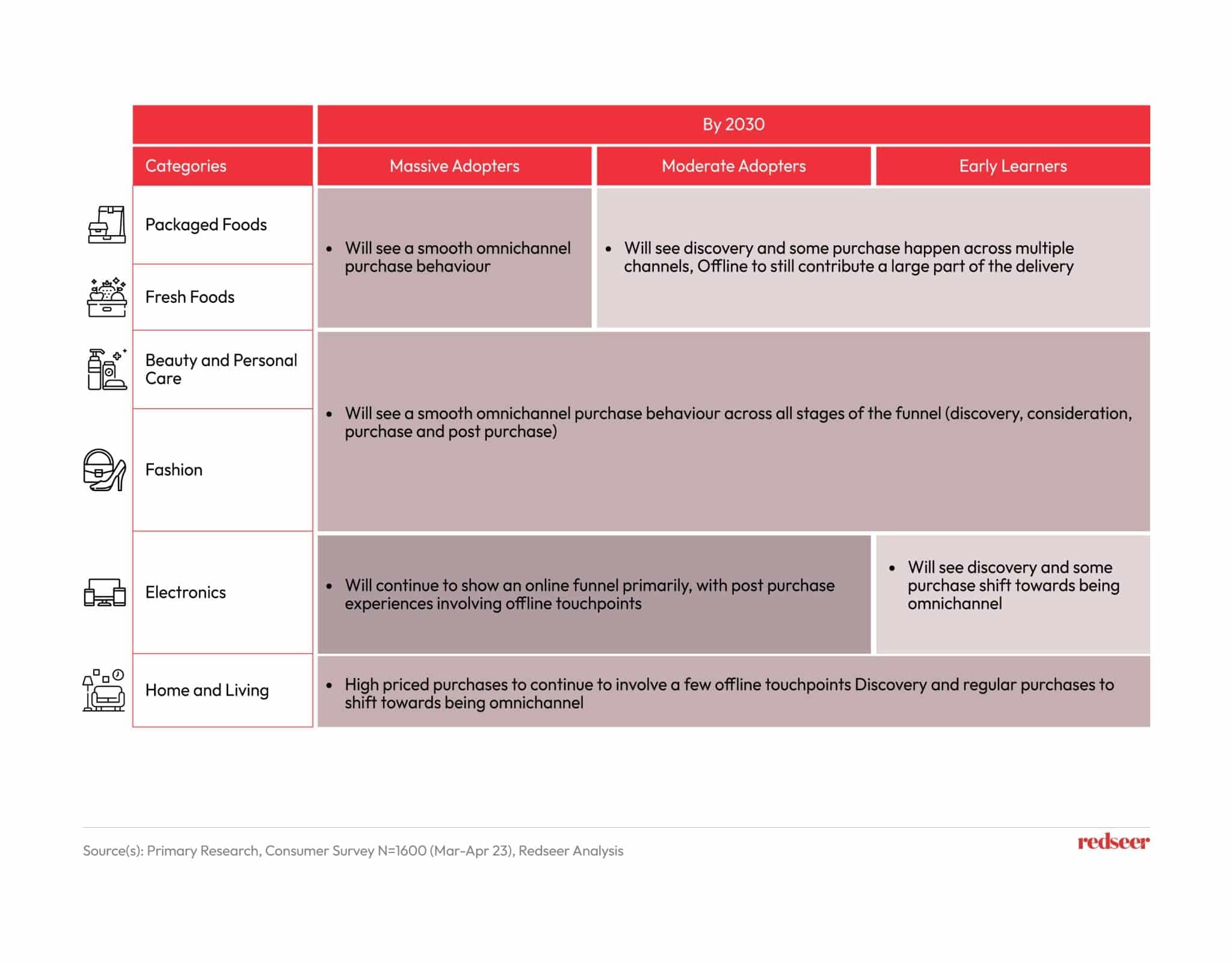 Above is a heatmap that showcases the expected prominence of omnichannel in consumer behavior by 2030. Especially in touch-and-feel-oriented categories like BPC, Fashion, and Home & Living, serving consumers across multiple channels and providing a seamless omnichannel experience will be a necessity to a certain degree. For others such as foods and electronics, probably the massive adopters (10% of Indian households who are the most sophisticated shoppers) will lead the demand for omnichannel while the rest of India follows gradually. Hence, brands across categories need to have careful long-term plans with this evolution in mind.