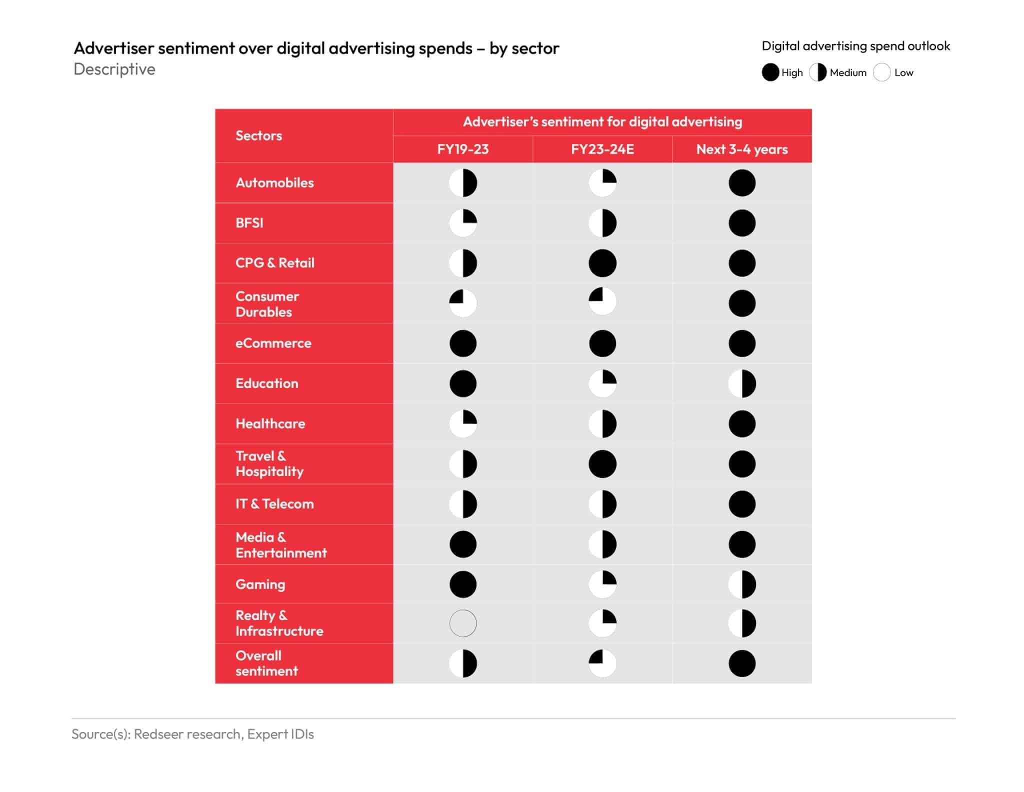 Over the next 3-4 years, advertisers’ sentiment towards Digital Advertising is expected to improve across multiple sectors pointing towards increasing advertising spending. Investments in Digital Advertising are driven by multiple factors across sectors. While the BFSI sector is expected to increase advertising spending to accelerate the uptake of financial tools, sectors such as healthcare invest in digital advertising to accelerate the promotion of preventive healthcare solutions. In the CPG & Retail sector, legacy players are utilizing the medium to advertise their own D2C platforms.