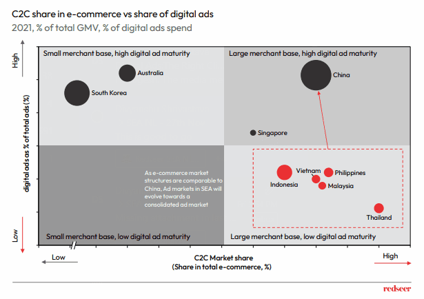 E-commerce markets in Southeast Asia are characterized by a large C2C share with a relatively lower digital ad maturity. There is significant headroom for growth among these markets as merchants will start to shift their ad dollar spend to higher levels while overall ad spend will continue to remain stagnant. We expect the ad markets in Southeast Asia to gravitate towards China’s market structure due to similarities in e-commerce landscape across the region
