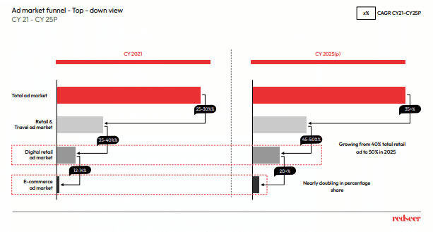 Brands and merchants alike are shifting from conventional advertising to digital advertising. Digital ads currently form ~35-40% of the total retail ad spend market and is expected to grow to 45-50% by 2025. E-commerce ads are set to grow to nearly double the share in the same period due to increasing merchant adoption.