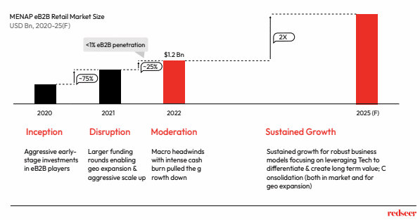 The growth story of eB2B had its inception in 2020 where many newly born eB2B players were able to attract the investors. Experiencing exponential growth, the eB2B market expanded in 2021, however macro headwinds with intense cash burn pulled down the growth. The eB2B market in MENAP is under penetrated and showing significant growth potential driving sustained future growth.