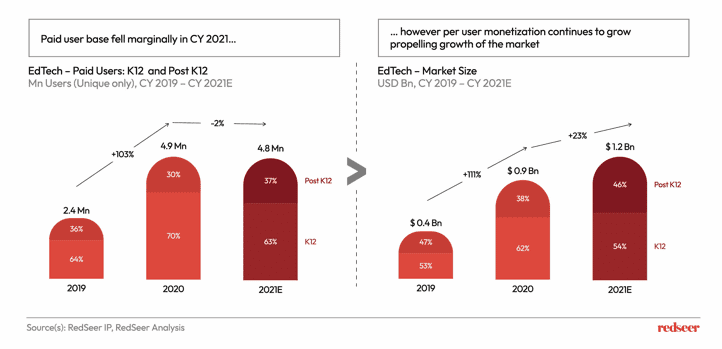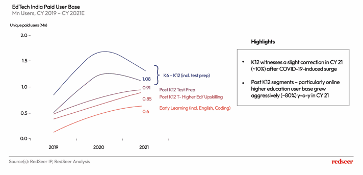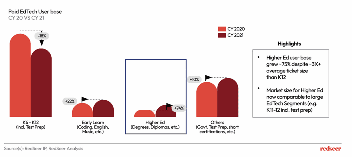 Soon after the COVID-19-induced pandemic, K12 and test prep in particular witnessed a dip in their growth. However, the same cannot be said for higher education category, as higher ed turned the tables around by emerging as the fastest growing sub-segment.