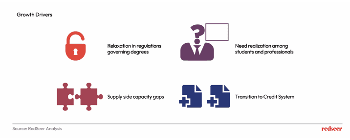 Relaxation in regulations governing degrees is one of the causal factors that is driving this growth forward. Thanks to this, EdTech companies can now partner with universities to offer online degrees. The unbundling of courses and democratization of access unquestionably boosts the demand for online higher education and also increases the completion rate. Another growth driver is the supply-side capacity gaps. India has supply-side constraints in education infrastructure (especially for specialized courses). Transition to the credit system as well as the realization of the need for higher education by students and working professionals who are new to the workforce, is further contributing to the boom in this sector.