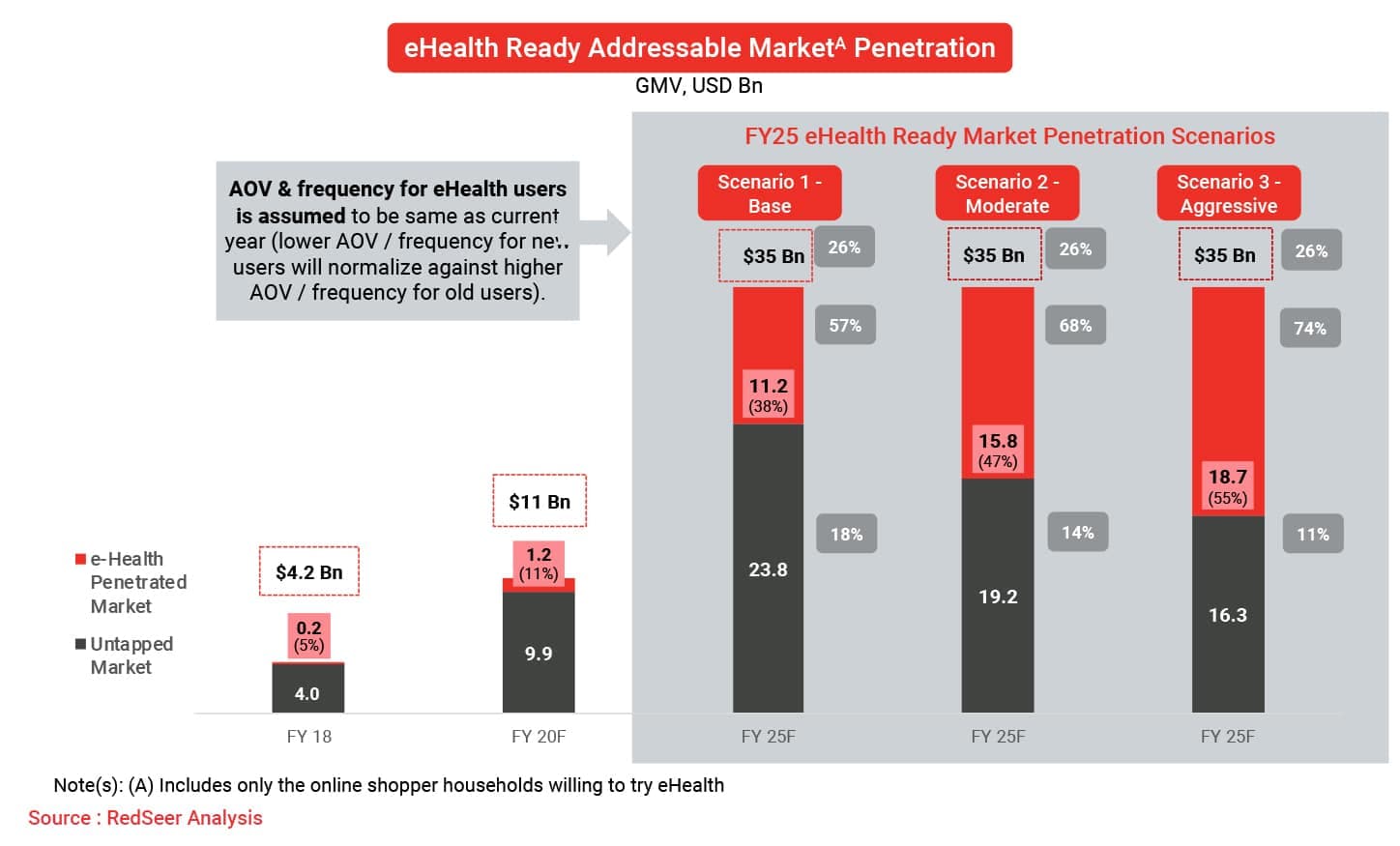 140 Mn eHealth ready households will provide an addressable opportunity of $35 Bn by FY25; ~38% to 55% of this opportunity is likely to be tapped by eHealth.