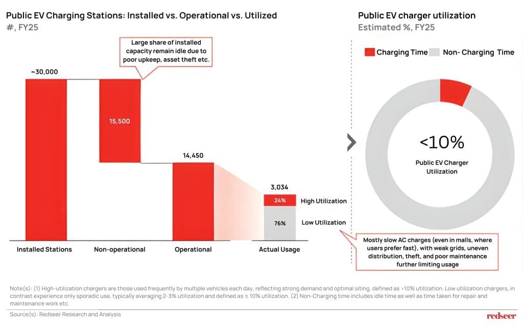 India’s EV charging network looks impressive on paper. The country has 30,000+ public stations, a 16x jump since 2022. But only about 15,550 of these are operational. Of those, fewer than 10% see meaningful utilisation.