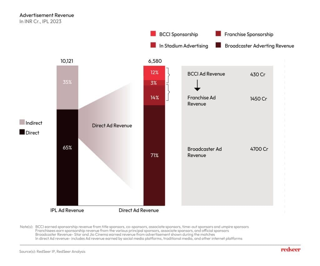 The total money spent on advertising was ~ INR 10,000 Cr during the IPL 2023, out of which 65% was direct revenue to the BCCI, franchisees, and broadcasters Star and Jio Cinema. The direct revenue came from different sponsors, while indirect revenue, which constituted 35% of the total, came from ad revenues on social media, traditional media, and other platforms on the internet.