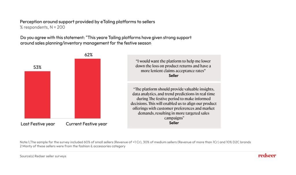 e-Commerce platforms are customizing their offerings to align with sellers’ requirements. As a result, seller perceptions regarding the support provided by eTailing platforms have improved. Currently, 62% of sellers agree that these platforms have been helpful in their festive planning, compared to the 53% who felt the same way during the previous year’s festive season. Our surveys have revealed that sellers particularly appreciate support on aspects like data analytics, trend forecasting, and enhancing consumer visibility, among other factors.