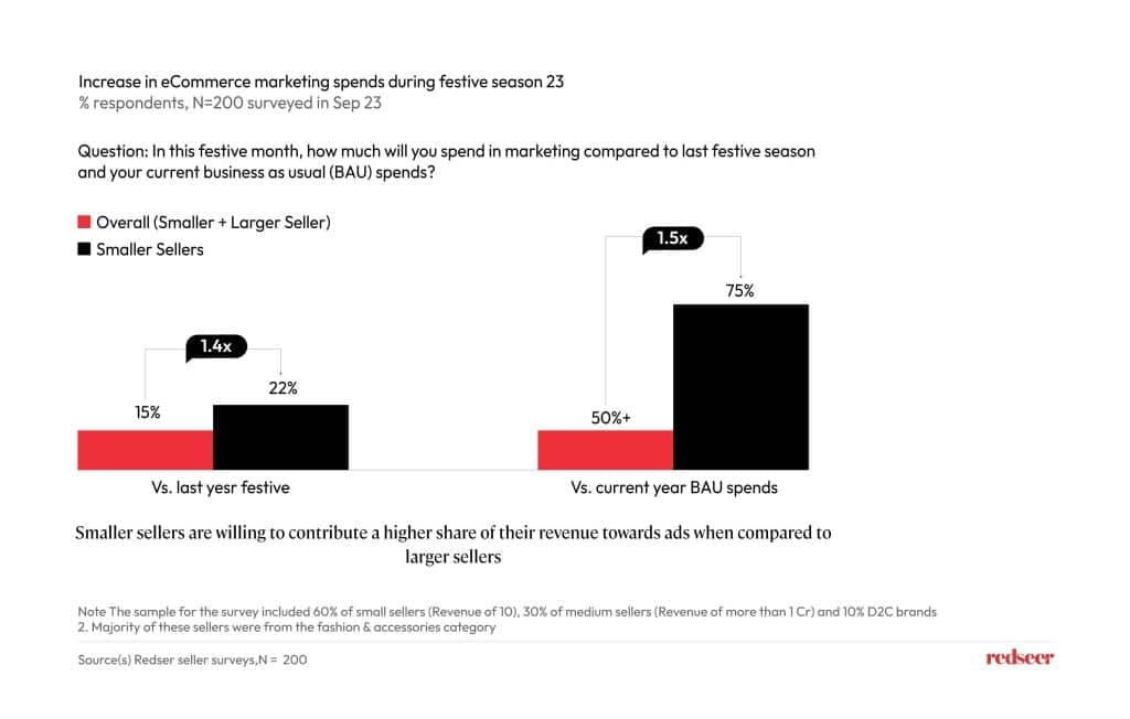 Among all the sellers surveyed, there is an expected 15% increase in marketing spending compared to the previous year’s festive season and a remarkable 50% boost in the marketing spend compared to regular business periods this year. Notably, smaller sellers display a high willingness to increase the allocation of funds towards advertising and are notably bullish about overall sales growth.