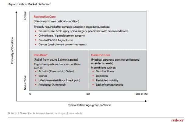 As per WHO, rehab helps optimise functioning and reduce disability in individuals with health conditions. In line with the same, physical rehab (excluding mental and drug/alcohol rehab) is classified into three major segments – restorative care, geriatric care and pain relief, depending on the criticality of the health condition and the patient age group. In addition, it typically involves providing products & services such as nursing, caregiving, physiotherapy, occupational therapy and medical equipment – these can be availed at home and rehab centres.