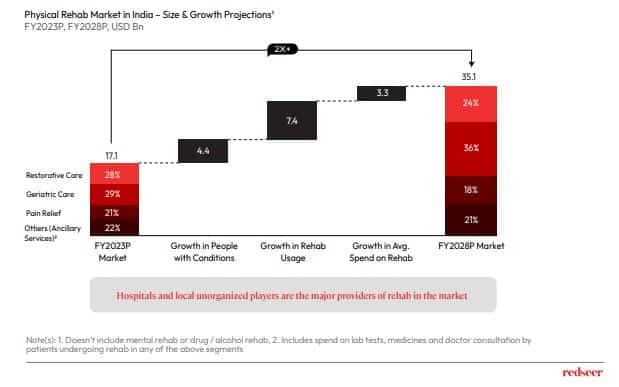 35-40% of the physical rehab spend in India is concentrated in the top 10 cities. The market is projected to grow at a CAGR of 15.5% in the next 5 years to reach USD 35 Billion by FY2028, primarily led by the increase in rehab adoption – lack of awareness & willingness, sparse availability and limited capabilities of rehab providers are currently restricting the usage of rehab, despite the strong need in certain health conditions.