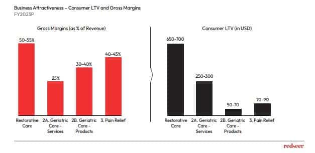 In addition to being a large opportunity, physical rehab comes with attractive business economics. This is indicated by the healthy gross margins of rehab providers and impressive consumer lifetime value across the major segments. For example, in the case of restorative rehab (which is ~28% of the market), a consumer typically uses it once in a lifetime but spends USD 650-700 (~INR 50k) for a rehab treatment lasting 12 days. Further, the restorative rehab provider makes 50-55% gross margins of this spend by consumers. This is quite lucrative compared to other health sectors, such as ePharma, wherein the consumer LTV is in the range of USD 50-70, with gross margins of 25-30%.
