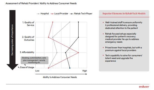 Consumers’ latent needs related to the ease of availing rehab (e.g. booking, customization, care plan management, remote monitoring etc.) have also become relevant in recent times. Rehab-tech players can address these needs via technology, which provides them with a further edge over traditional hospitals & local rehab providers. Moreover, the usage of the technology enables these players to accelerate their consumer acquisition and deepen engagement, translating to faster growth in business.