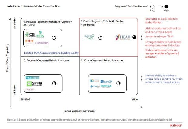 The rehab tech players are classified based on the extent of rehab segment coverage, at-home and at-centre rehab capabilities and the degree of tech enablement. Players with wide segment coverage have access to a larger TAM and the potential to create a stronger brand in the rehab space among both consumers and doctors. Also, having centre-based rehab capability is a strong moat, given certain key health conditions (especially in restorative care) require patients to undergo rehab at centres. Moreover, players with stronger tech enablement are better placed to thrive in the market, as they are likely to build superior consumer acquisition and retention funnels.