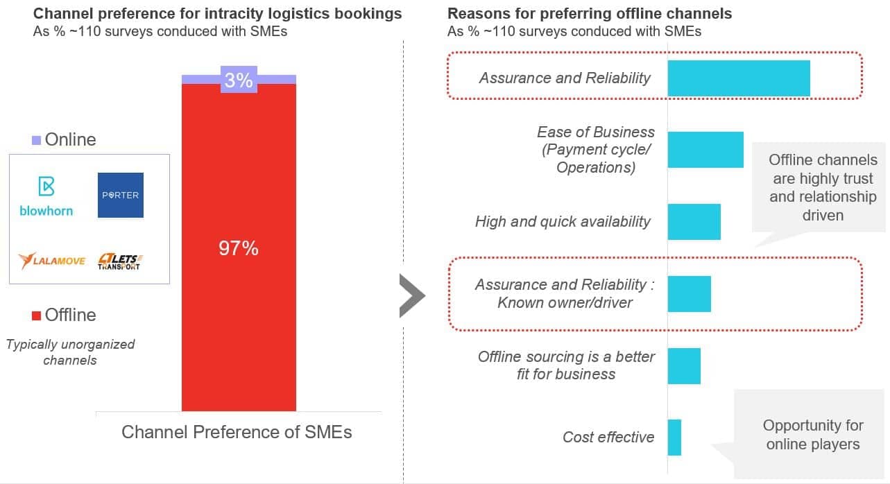 - SMEs still strongly prefer offline channels for intracity shipping, largely due to strong relationships with offline partners which drives high availability, reliability and smooth operations