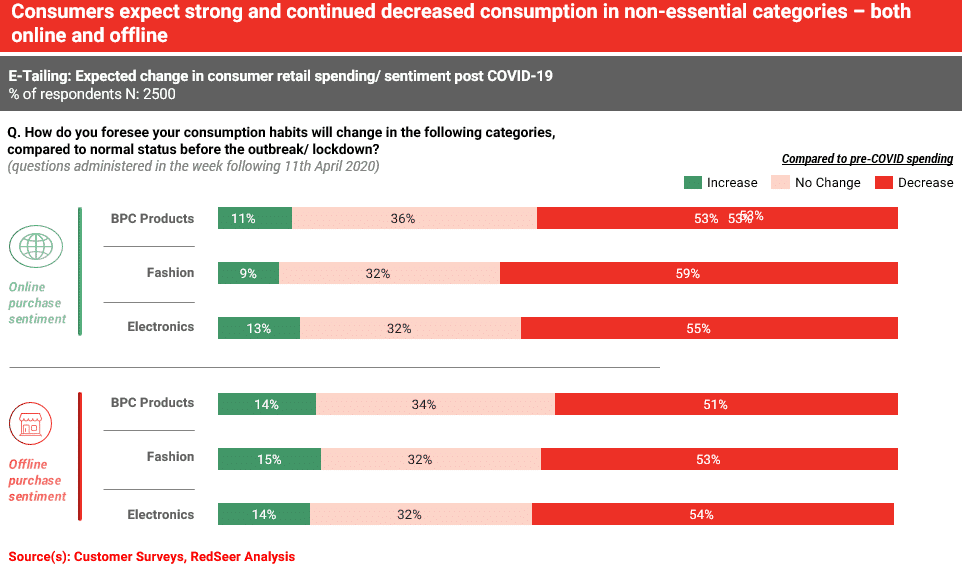 Even post lifting of the restrictions, eCommerce is likely to have a tough recovery curve- as made clear by majority o consumers saying that their spending post COVID on these categories will be lower than pre-COVID levels- across online as well as offline channels.