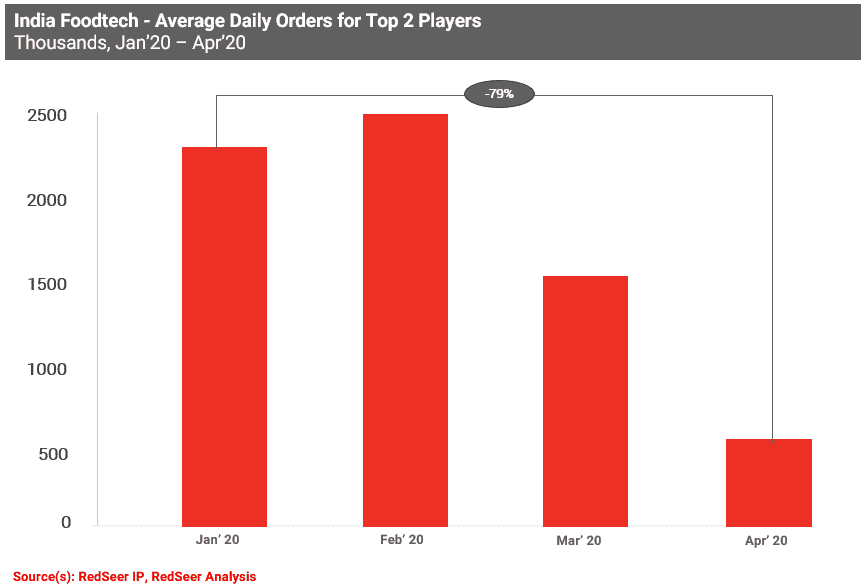 Orders for leading Foodtech players have dropped by ~80% in the month of April owing safety concerns, WFH being implemented, junta curfews and operations stoppages and collapse in discretionary consumption in Tier 2+ cities.