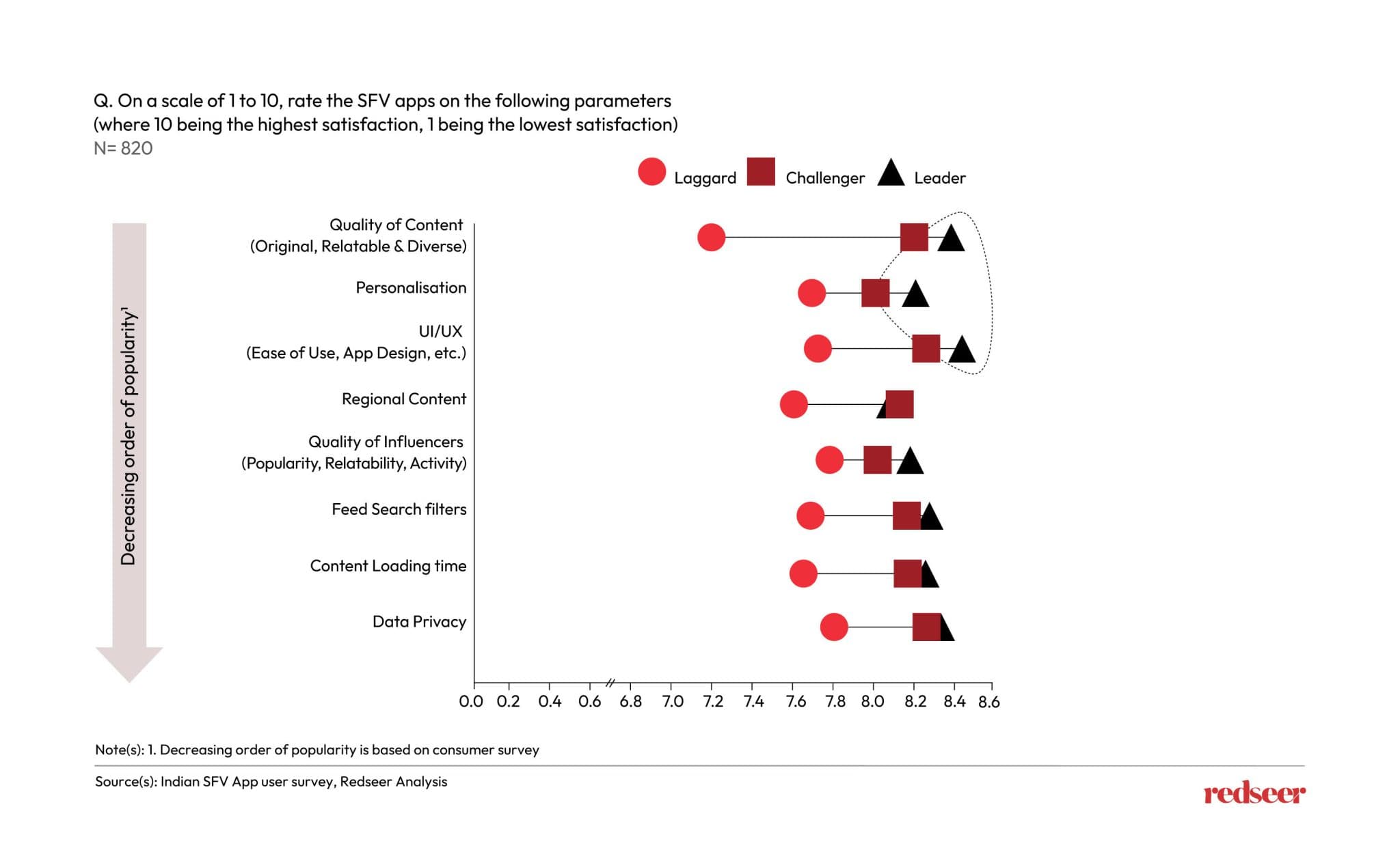 Users were made to rate their in-platform experience across parameters including Content Quality, UI/UX, Data Privacy, Loading Time and Quality of Influencer on an 8.6-point scale. The market leader is seen to have outperformed its competitors in 7 out of 8 key parameters, earning points in the 8.2-8.6 range. SFV platforms by themselves are seen to have earned a heightened overall net positive sentiment among users in comparison to real money gaming, OTT video, and audio series.