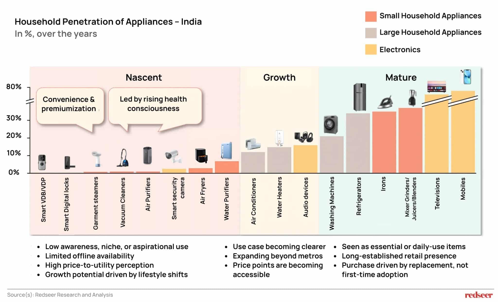 While a few appliances and electronics like mobiles, televisions, mixer grinders, irons, refrigerators, and washing machines have achieved decent penetration, most other appliances remain underpenetrated with single-digit or double-digit household penetration.