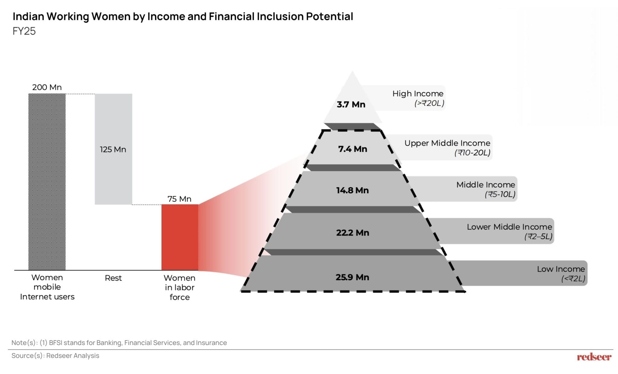 Translated into market size, these numbers are hard to ignore – an untapped AUM pool of approximately INR 2,00,000 billion, an insurance pool of INR 17,000 billion, and a lending base of INR 67,000 billion, all among women who are either underserved or not served at all. The immediate target is approximately 75 million working women with mobile internet access, spread across income brackets from below INR 2 lakh to above INR 20 lakh annually.