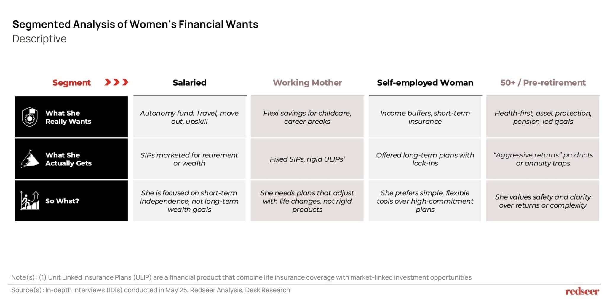 The second is product misalignment. A salaried woman in her late twenties is largely looking for an autonomy fund, money she can use for travel, upskilling, or independence. What she typically gets is a SIP pitched around retirement. A working mother needs savings that flex around career breaks. She gets fixed SIPs and rigid ULIPs. A self-employed woman wants short-term income buffers and simple insurance. She is offered long-term plans with lock-ins. Across every life stage, what women want and what they are sold are remarkably different.