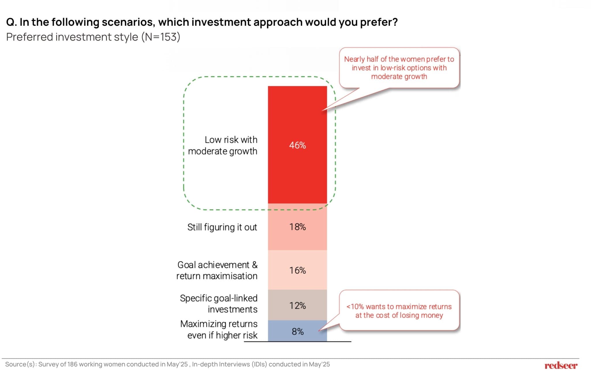 When asked about their preferred investment style, only 8% wanted to maximise returns at higher risk. 46% preferred low-risk options with moderate growth. 16% wanted goal-linked investments that also delivered reasonable returns. And 18% said they were still figuring it out. Taken together, the picture is one of women who want clarity, safety, and relevance, none of which the current product architecture reliably provides.