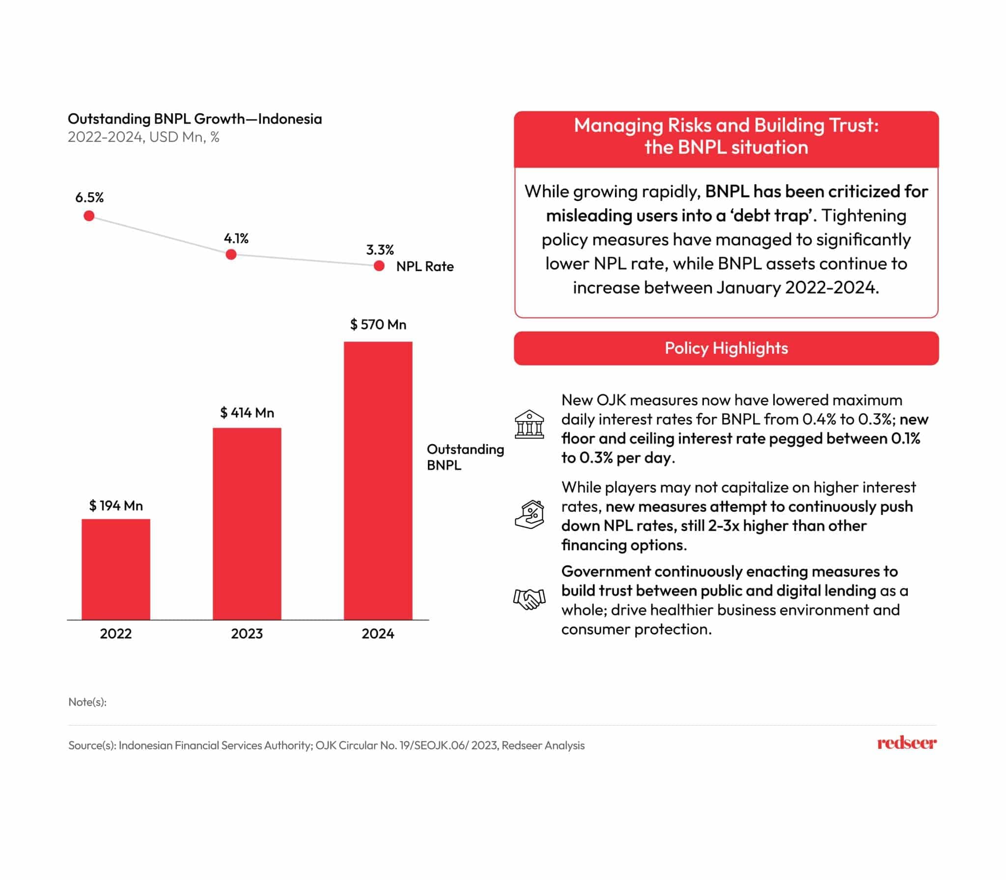The Indonesian Financial Services Authority (OJK) had recently lowered daily peer-to-peer-based BNPL interest rates from a previous 0.4% maximum to 0.3% per day. Lender interest rates will be set between the daily rates of ~0.1% (floor) to 0.3% (ceiling).