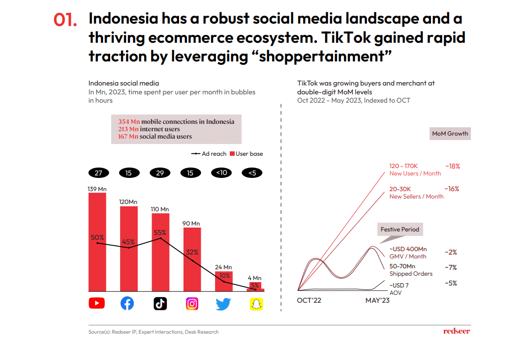 TikTok witnessed a jump of ~26% in average time spent per user and is soon expected to take over WhatsApp due to the high demand for short content videos among Indonesians. This affinity for short-form content along with a seamless user journey, allowed it to capture a wide ecommerce customer base as it pursued an aggressive discount-led growth strategy.