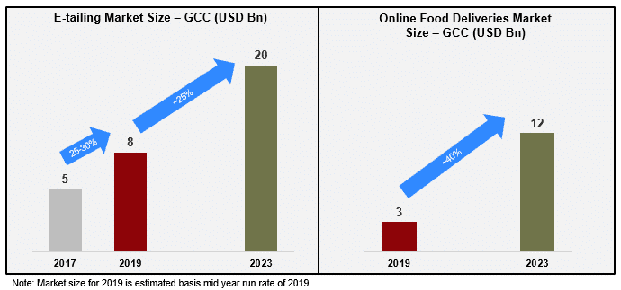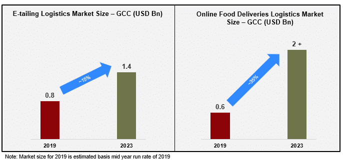 Logistics is driving eCommerce in GCC; the two key sectors of Etail and online food deliveries stand at ~$11 Bn, expected to grow ~3X in next five years