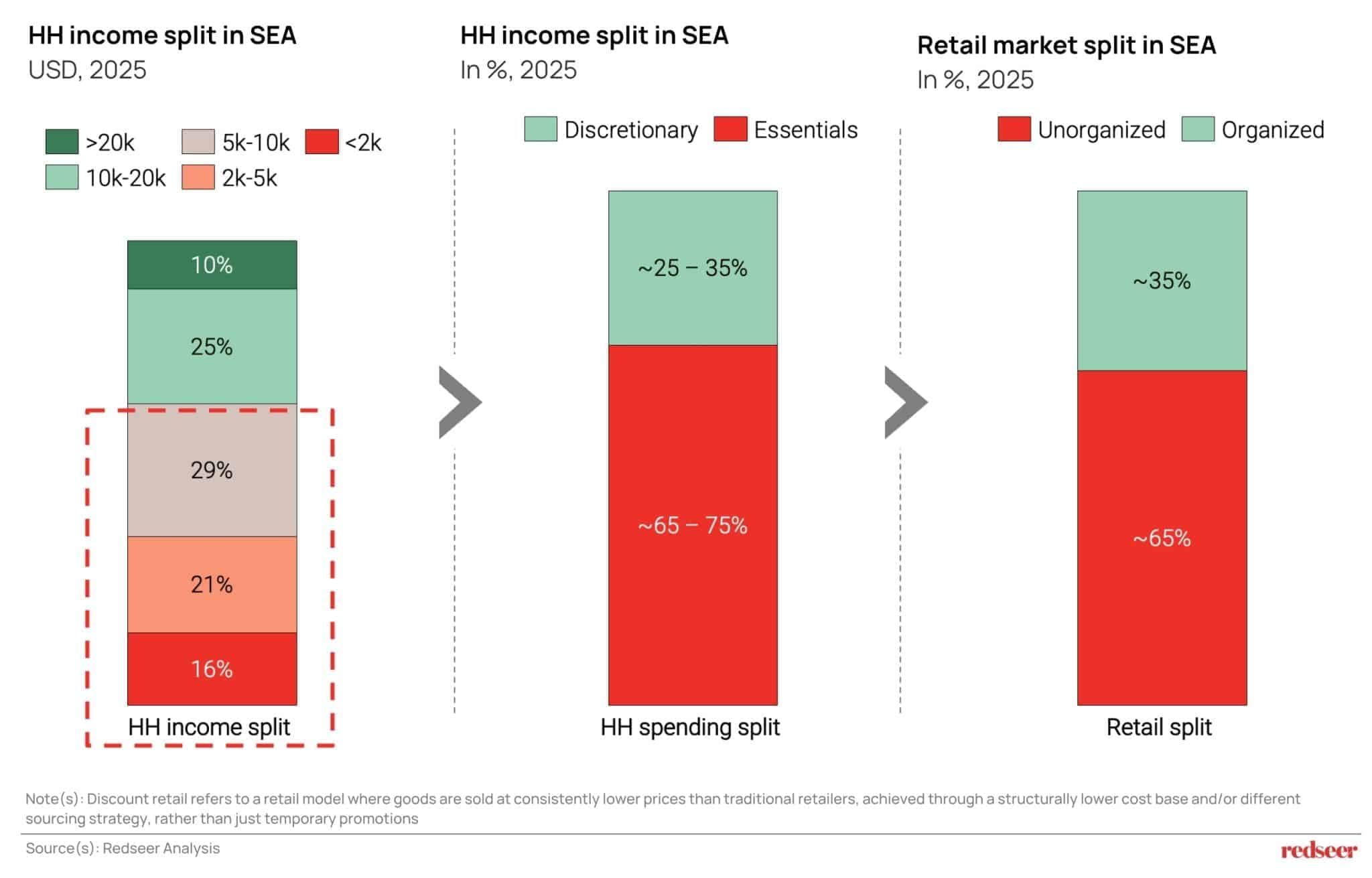 Income constraints, limited discretionary buffer, and fragmented traditional retail create structural demand for discount retail across SEA
