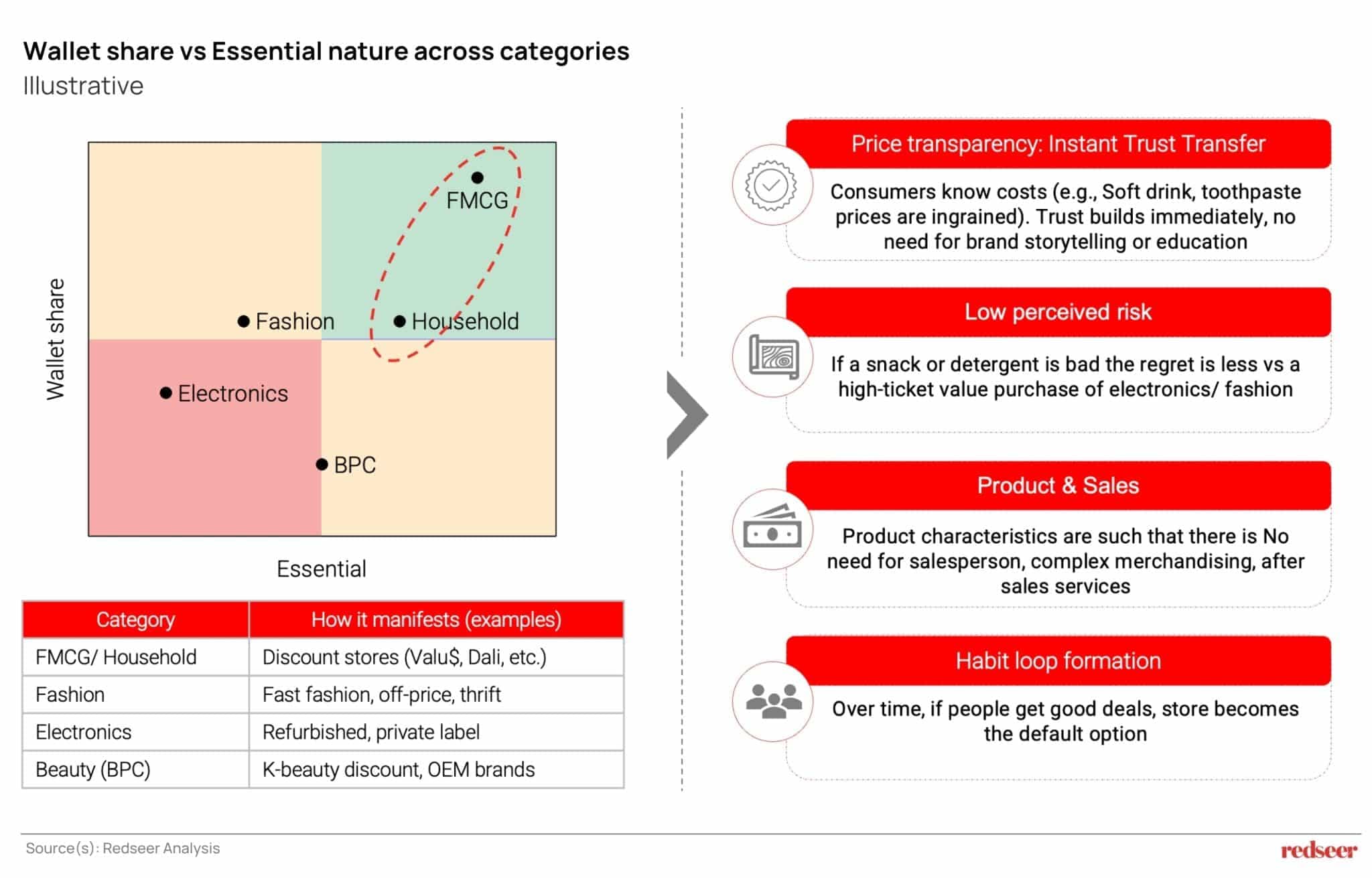 And within retail, FMCG and household products are appropriate categories for discount retail owing to the essential/ staple product nature and high wallet share