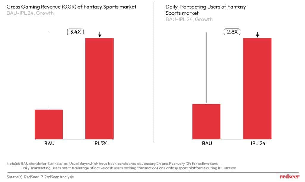Ever wondered how the IPL stacks up against the quieter times? Let’s break it down: When comparing the IPL 2024 season to business-as-usual (BAU) periods, like January and February, where cricket was barely on the radar, the impact of the IPL on fantasy sports is crystal clear. During the IPL, daily GGR was a whopping 3.4 times higher than in the BAU period, and the number of daily transacting users shot up by 2.8 times.