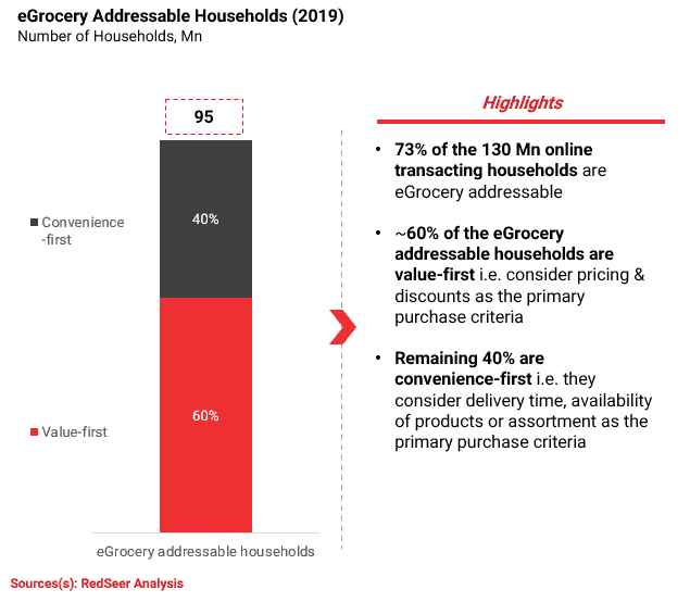 Value-first models have a base of 57 Mn eGrocery addressable households, compared to 39 Mn addressable households for convenience first models (basis the grocery purchase criteria of the online transacting households in India).